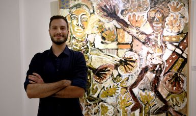 Alex Lazard (Ciudad de México, 1986). Se formó como pintor y grabador en diversas instituciones y talleres en México y en el extranjero, entre los que se encuentran el Taller del maestro Gilberto Aceves Navarro. Tomó cursos en la Escuela Nacional de Pintura, Escultura y Grabado ’La Esmeralda’ (CDMX, México), en la Universidad de Barcelona (España) y la Angel Academy of Classic Art (Florencia, Italia). Su obra se gesta en la búsqueda de lo primitivo, utilizando simbolismos arquetípicos desde una exploración personal que se adentra en la complejidad de la psique y sus formas, de manera en la que el artista no busca referencias externas, sino imágenes desde la inmensidad del inconsciente. La ejecución de la obra es visceral; la intuición y el error son parte fundamental del proceso creativo del artista. Las obras de Lazard no se preconciben sino que se gestan a medida que la materia y sus particularidades dan forma a la imagen, al juego, en el que Lazard funge como un médium de lo que no se ve, de lo primigenio. La deformación en sus imágenes crea mundos particulares, en los que el espectador se vuelve un detective de la narrativa que propone el artista, quien transita por una búsqueda inagotable por ’bajar la información’ y plasmar sinceramente lo que ve y siente.
