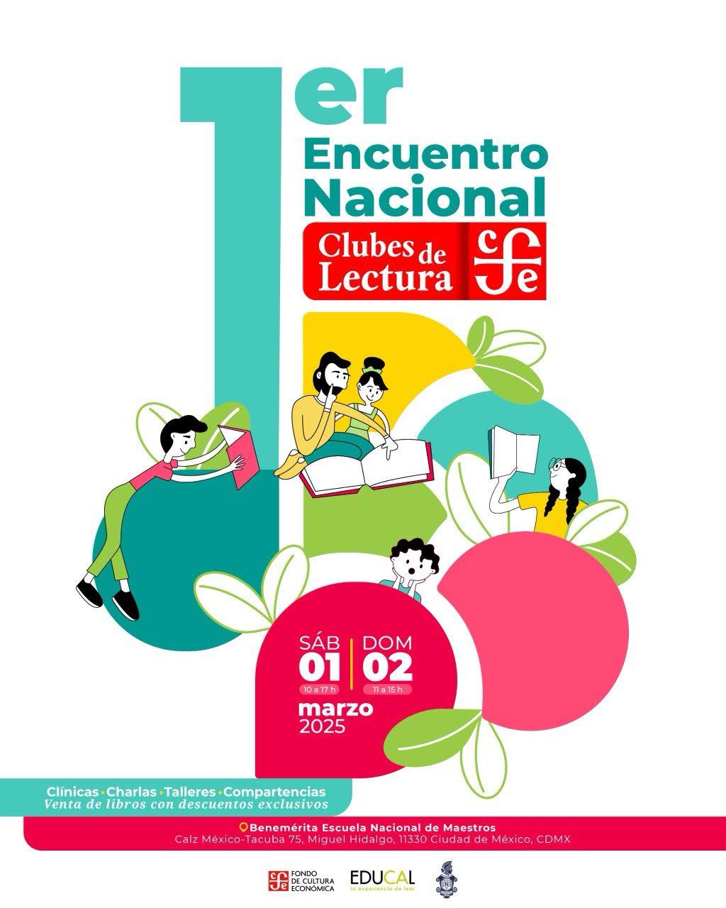 El 1 y 2 de marzo próximos se realizará el Primer Encuentro Nacional de Clubes de Lectura del Fondo de Cultura Económica (FCE), con la participación de más de dos mil personas de las comunidades lectoras de todo el país, en la Benemérita Escuela Nacional de Maestros, ubicada en Calzada México-Tacuba 75, Alcaldía Miguel Hidalgo, en la Ciudad de México.