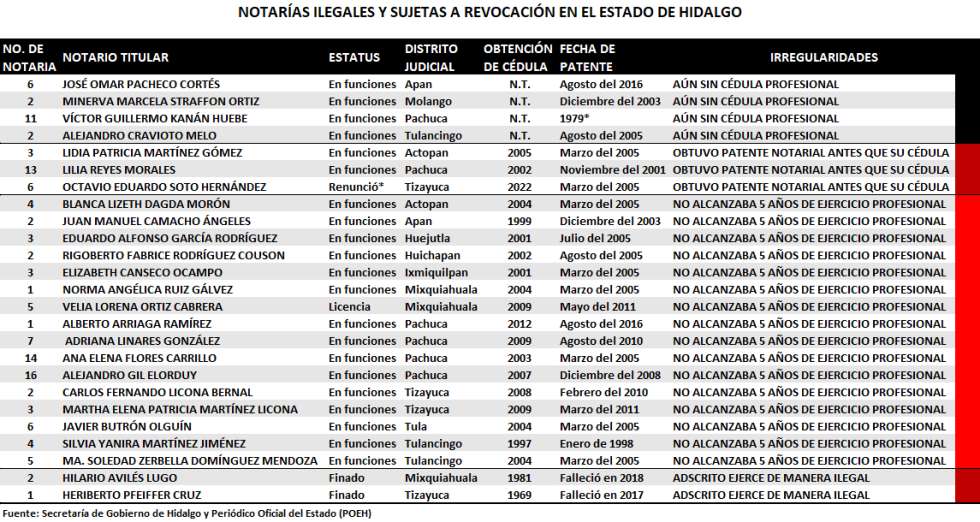 Una por cada cuatro notarías en Hidalgo observa irregularidades por las que podrían ser revocadas, pues algunas de sus patentes fueron entregadas sin cumplir las disposiciones que marca la Ley en tanto otras siguen operando a nombre del titular aún cuando este lleva años de haber fallecido, condición por la cual el Ejecutivo estatal puede -y debe- cancelarlas en cualquier momento.